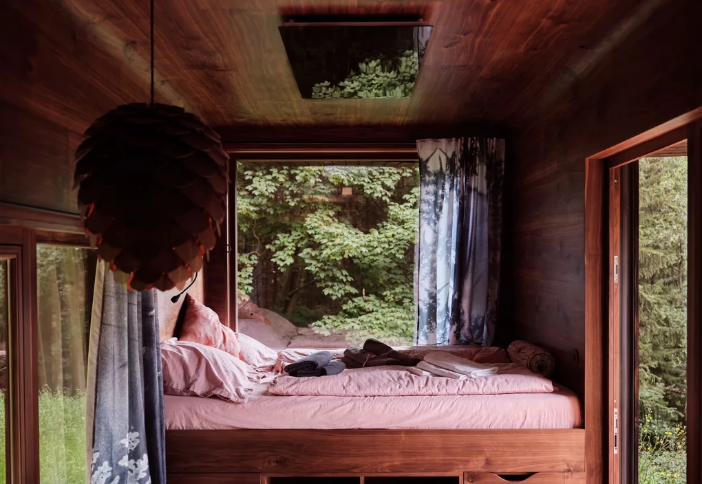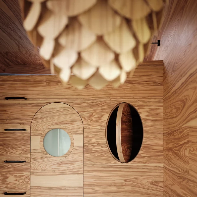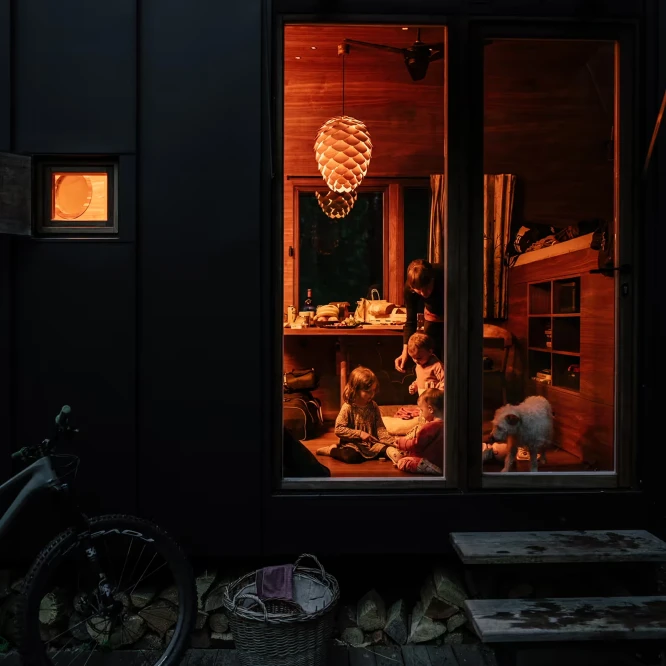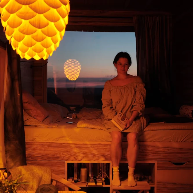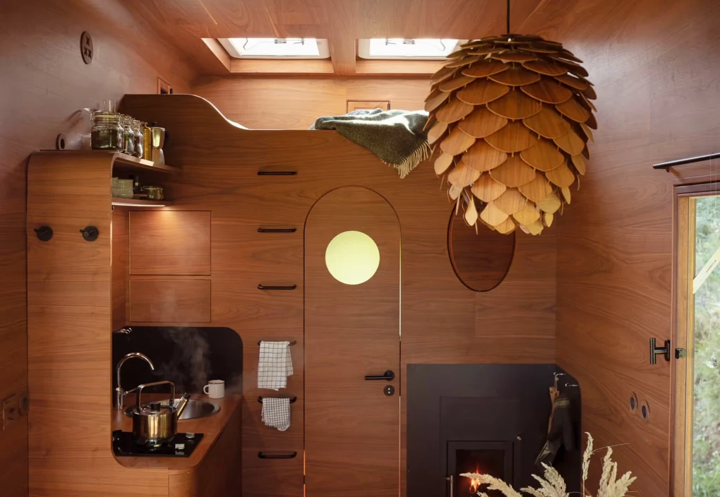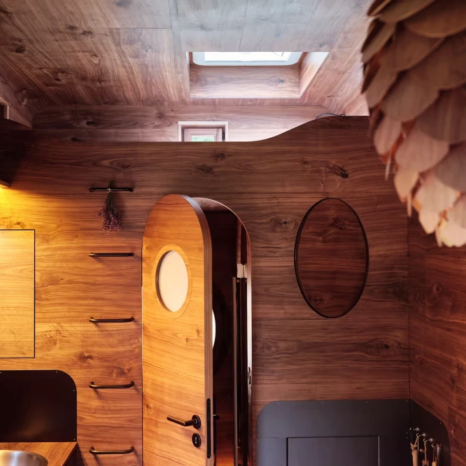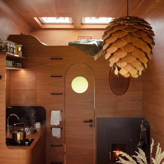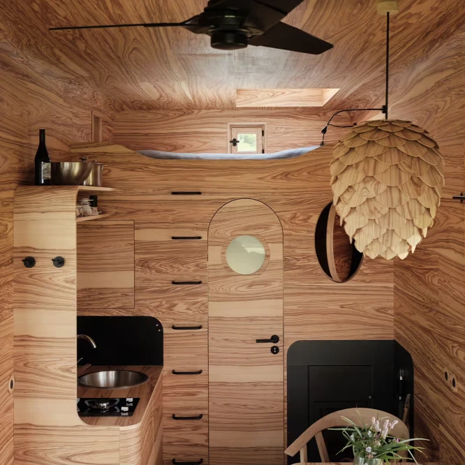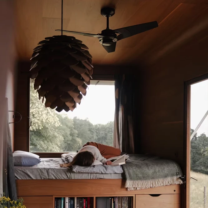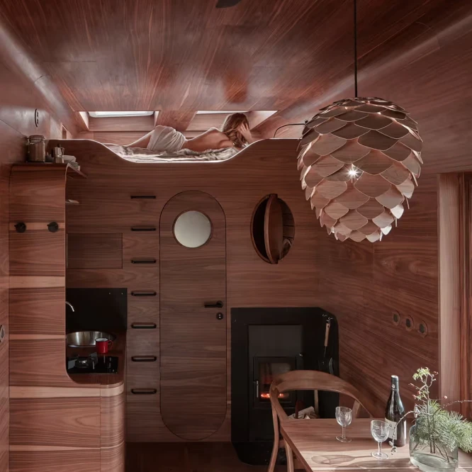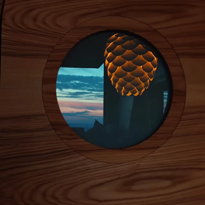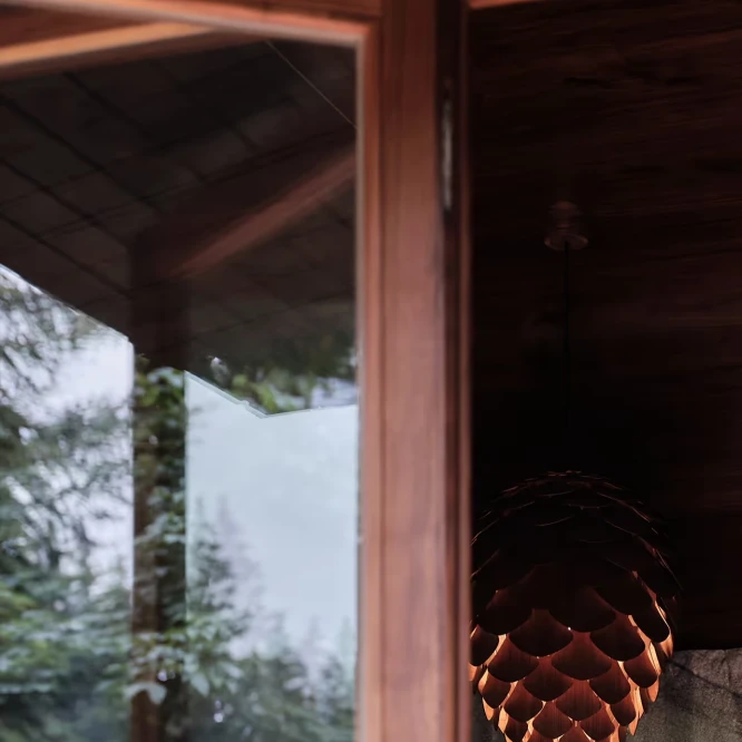 Za vývojem a designem domků i lustru stojí architekt Martin Kožnar. Obojí vzniklo pro glampingový projekt hideandseek Vladimíra Peška, který se na vzniku Šišky také podílel.